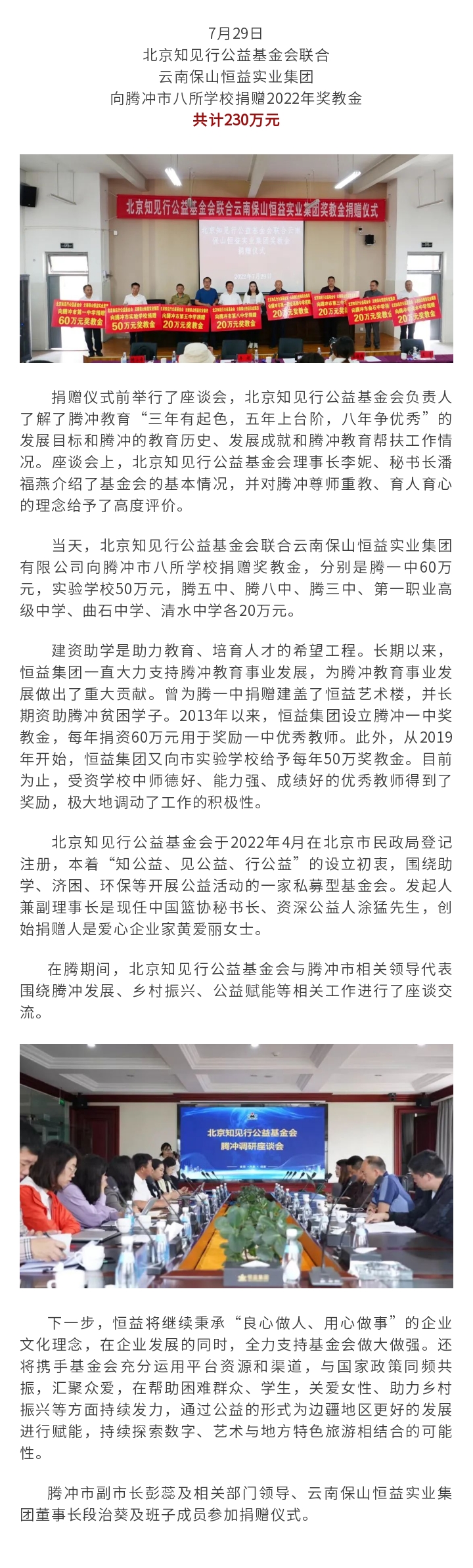 2018年9月10日,榜樣的力量暨第34個教師節,恒益集團向中共騰沖市委市政府捐資15萬元;