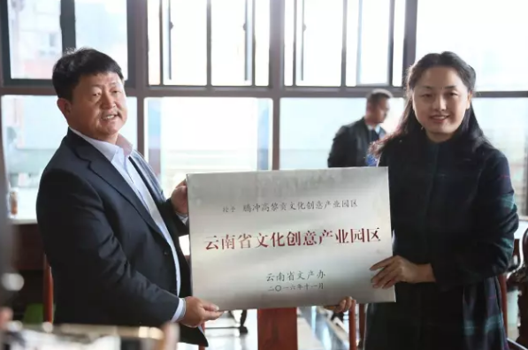 在恒益集團董事長段治葵先生講話完畢后,授牌儀式正式開始,段董事長從胡部長手中接過寫有“云南省文化創意產業園區”的牌子,雙方進行了合影留念,正式完成對騰沖高黎貢文化創意產業園區的授牌。