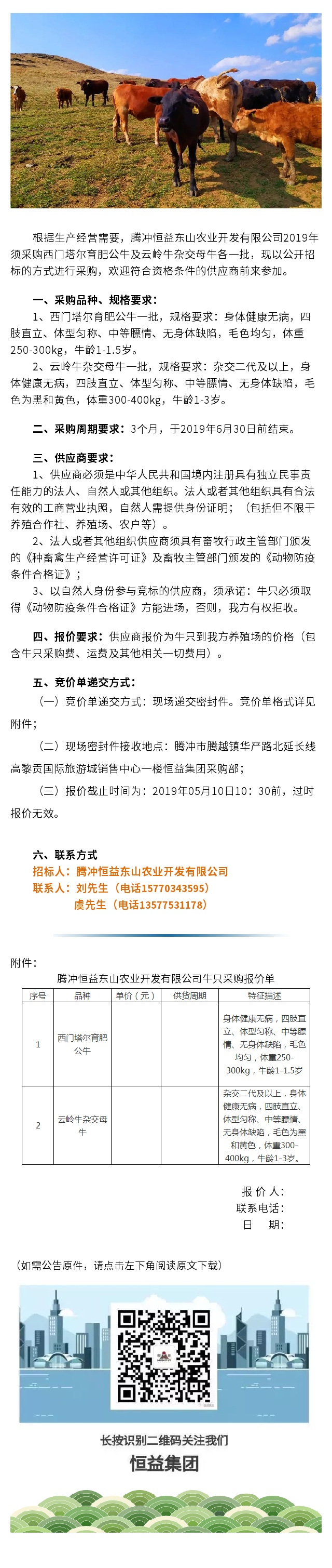 騰沖恒益東山農業開發有限公司牛只采購競價招標公告