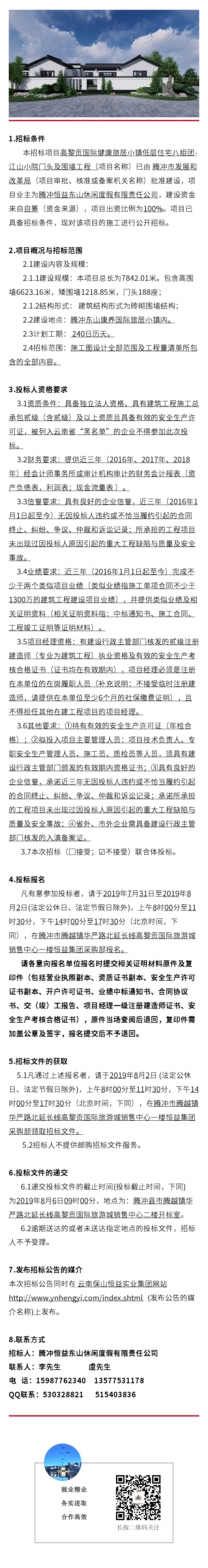 高黎貢國際健康旅居小鎮低層住宅八組團—江山小院門頭及圍墻工程招標公告 來源: 瀏覽量:11221 日期:2019-08-01 分享到: 上一篇:騰沖市恒益礦產品經貿有限責任公司關于鋅精礦競價銷售公告(201905)號 下一篇:高黎貢國際健康旅居小鎮低層住宅八組團-江山小院精裝樣板房裝修施工工程招標公告