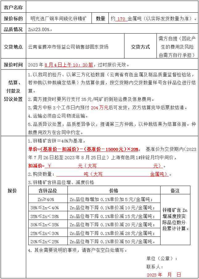 騰沖市恒益礦產品經貿有限責任公司(以下簡稱“我司”)根據生產經營安排,將面向社會對我司2023年7月前所產鋅精礦進行公開競價銷售,誠邀廣大有合作意向的客戶前來咨詢并參與競價,現將相關事宜公告如下:
