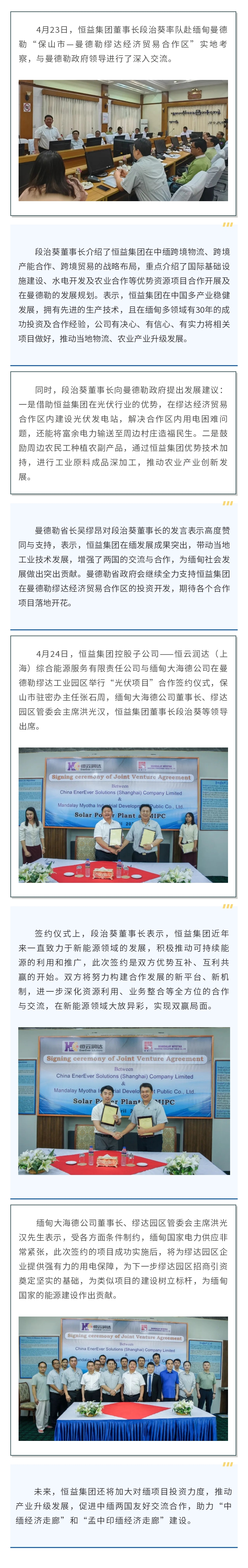 恒益集團董事長段治葵率隊赴緬甸曼德勒考察,簽署“光伏項目”合作協(xié)議 來源: 瀏覽量:6464 日期:2024-04-26 分享到: 上一篇:五一浪漫打卡點丨恒益南玫莊園玫瑰采摘節(jié) 下一篇:云南保山恒益實業(yè)集團有限公司與云南保山產(chǎn)業(yè)園區(qū)管理委員會簽訂戰(zhàn)略合作協(xié)議