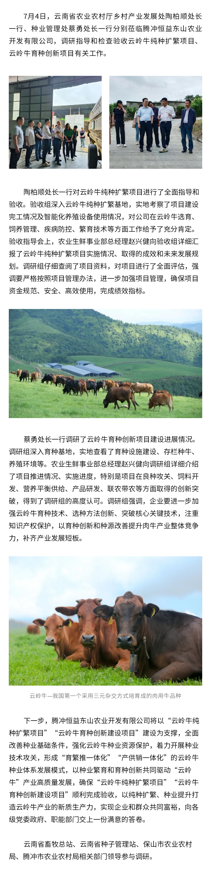 云南省農業農村廳領導蒞臨恒益東山農業調研云嶺牛項目工作 來源: 瀏覽量:5176 日期:2024-07-08 分享到: 上一篇:恒益集團組織召開第三屆董事會第一次會議暨2024年半年度經濟運行分析會議 下一篇:恒益集團再獲殊榮!