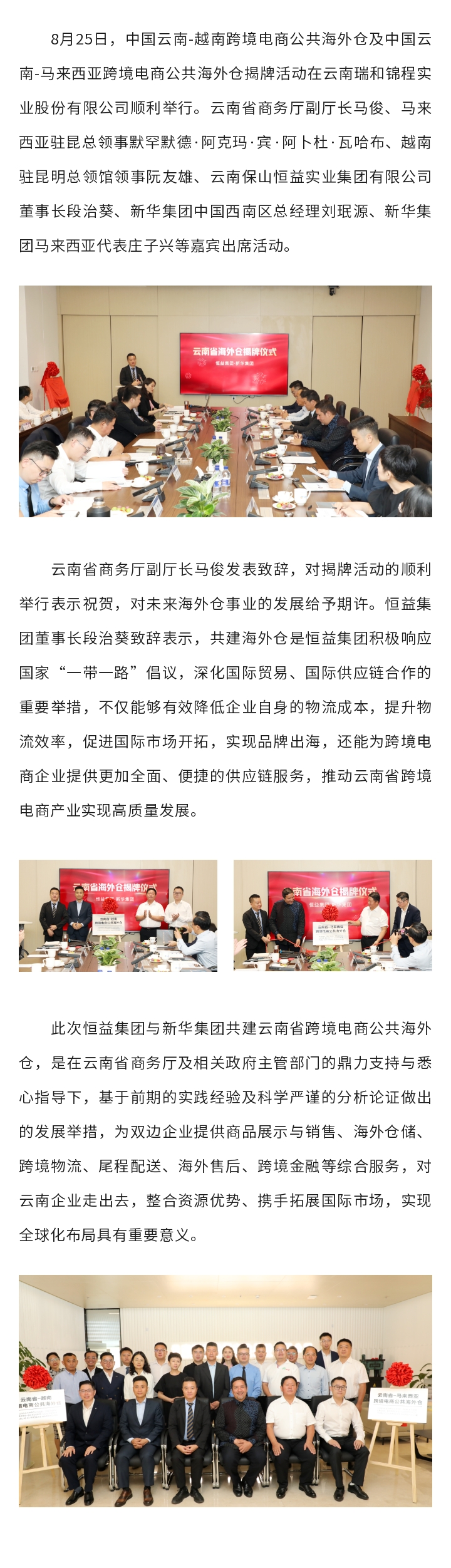 恒益集團與新華集團共建中國云南-越南及中國云南-馬來西亞跨境電商公共海外倉揭牌活動順利舉行 來源: 瀏覽量:5198 日期:2024-08-26 分享到: 上一篇:恒益集團組織開展《管理會計在經營中的應用》培訓 下一篇:中國工程院“我國特色醫康養產學研體系建設研究”戰略咨詢會暨云南省溫泉醫康養產業發展工作推進研討會順利舉行