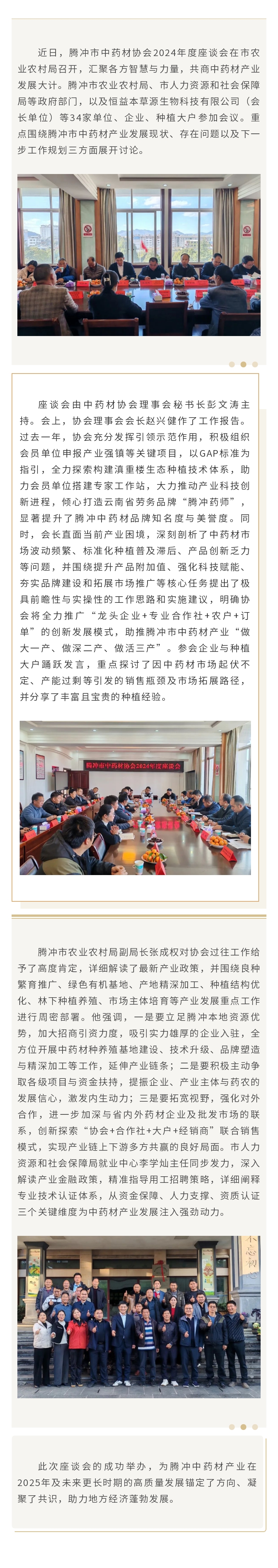 騰沖市中藥材協會2024年度座談會圓滿召開,共繪產業發展新藍圖 來源: 瀏覽量:4309 日期:2025-01-06 分享到: 上一篇:猴橋鎮攜手恒益本草源,共譜中藥材高質量發展新篇章 下一篇:騰沖科學家論壇·溫泉醫康養產業創新發展論壇成功舉辦,多項簽約及受聘儀式同期舉行