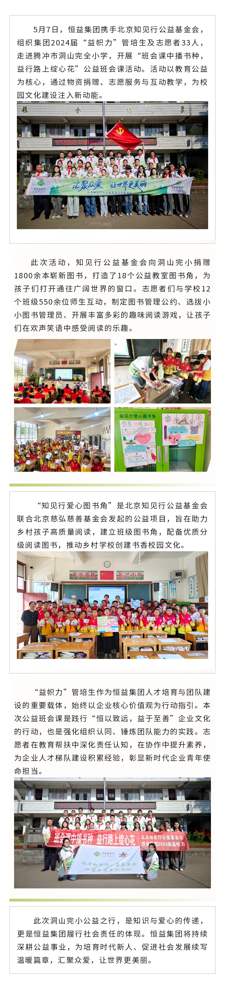 恒益集團攜手知見行公益基金會,助力鄉村學子“悅”讀未來 來源: 瀏覽量:3474 日期:2025-05-08 分享到: 上一篇:騰沖東山草原定制公交開通,暢玩草原更輕松 下一篇:五一 ▏恒益第六屆玫瑰采摘節,與花海抱個滿懷!