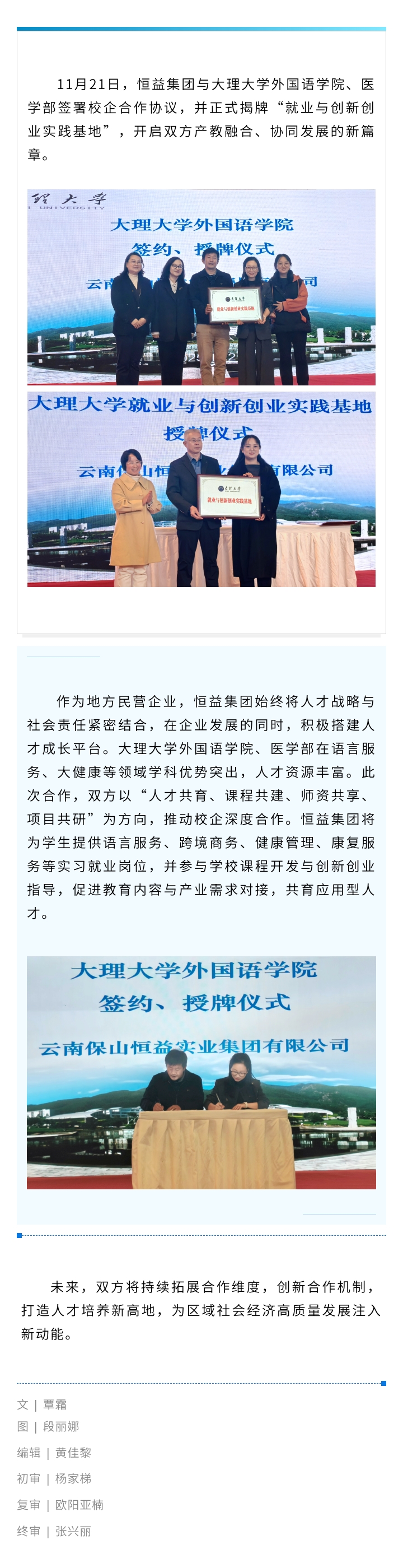 恒益集團與大理大學共建實踐基地 開啟產教融合新篇章 來源: 瀏覽量:1460 日期:2025-11-21 分享到: 上一篇:邀請函 | 2025騰沖科學家論壇·旅居與醫康養創新發展論壇即將盛大啟幕 下一篇:恒益集團與云南財經大學簽約授牌 共啟文旅育才新篇章